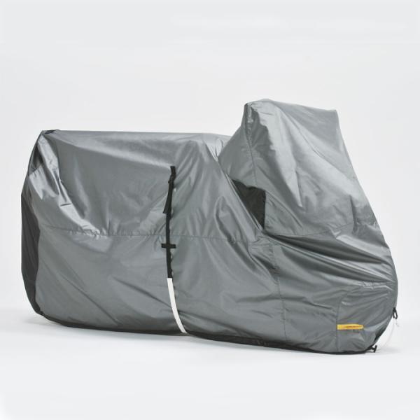 ワイズギアのバイクカバーは、純正ならではの車体シルエットに合わせた設計で、ヤマハ車はもちろん他メーカーにも対応します。ハンドルロック状態(左側)に合わせた立体裁断でかぶせやすく、風を巻き込みにくいスソ絞りタイプなのでボックスを装着した車体にぴったりフィット。防水・撥水性能が高く、前後の固定バックルがあるので風にも強い仕様です。