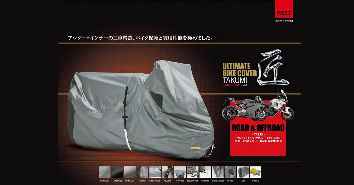 レイト商会のバイクカバー匠Ver.2は、雨、風、埃、紫外線からバイクを守る独自の二重構造。