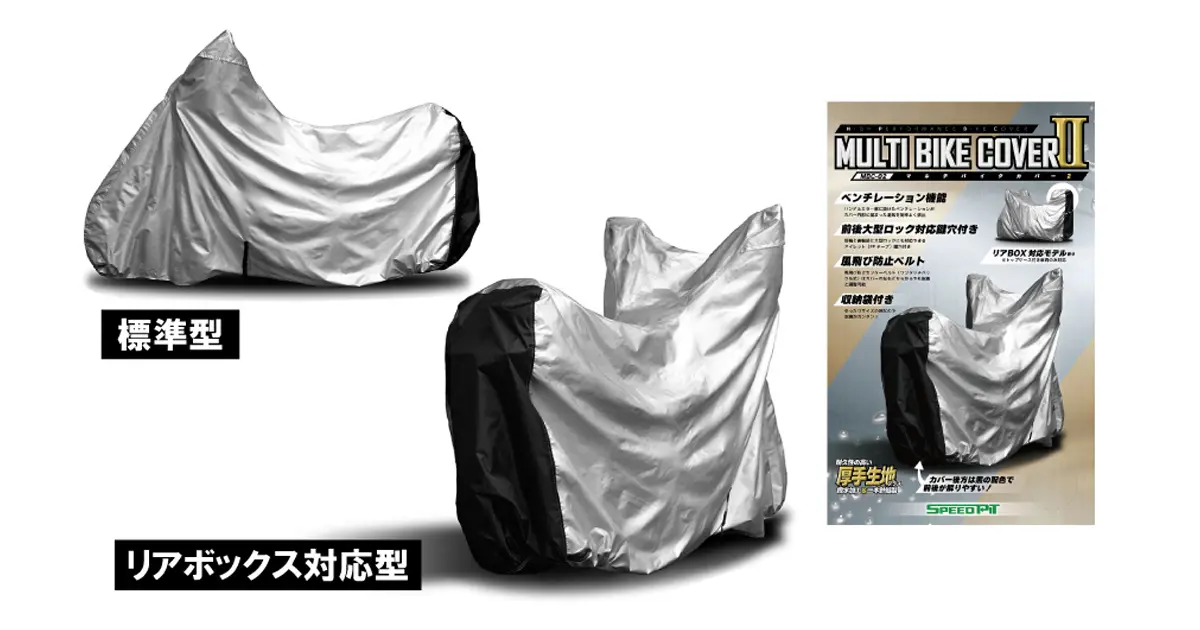 SPEED PITのマルチバイクカバーⅡは、厚手生地150デニールシルバーオックスを使用し、二本針縫製で耐久性の高いバイクカバー。ベンチレーション機能搭載で湿気を効率よく排出し、撥水加工で雨からバイクを守ります。カバーの後方は黒配色で前後が分かりやすくなっています。ゆったり目の収納袋付きで便利。リアボックス対応型のサイズとしてL-BOX、6L-BOXがあります。
