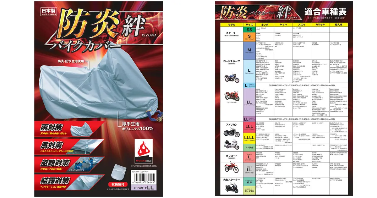 平屋産業の防炎バイクカバー 絆は、難燃加工を施した生地(ポリエステルオックス)を使用し、防炎、透湿防水、防風、防犯効果が期待できるバイクカバー。表面に撥水加工を施してシルバーコーティングすることで耐光性を上げてあり、雨や汚れを防いで熱や紫外線からバイクを守ります。適合表でリアトップボックス付・フル装備・大型BOXのサイズを確認して選べばばっちりです。