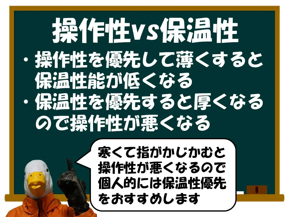 ただ自分の基本的な考えとしては操作性よりも保温性を優先することをお勧めしています。 というのも保温性が操作性にも直結するのが冬だからなのです。