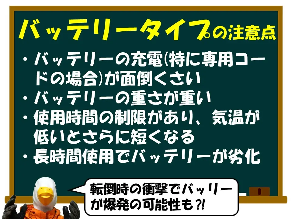 まずバッテリータイプなのですけれども、これは充電がちょっと面倒くさい。特に専用ケーブルだったりするともうイライラしますよね。ただ最近はスマートフォンと同じようにUSB-Cで充電できるものも出始めていますので、そういった物の方が利便性は高いでしょう。そして当然グローブの中にバッテリーを収納するわけですから重量感も出てきます。