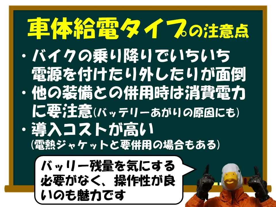 「バッテリー残量を気にせずににガンガン使いたい」「充電が面倒くさい」という人は、車体から直接給電するタイプがおすめです。バイクの車体から電源が供給されるため、基本的にはガンガン使うことができ、寒さ知らず。 このタイプであれば、充電の手間もなく重さも感じることはなくより、快適に使用することができます