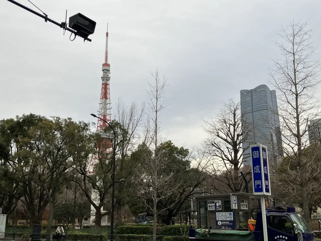 出発してすぐに右手に皇居や日比谷公園を見ながら国道1号を進むと、御成門交差点でそれまで建物で隠れていた東京タワーがいきなり現れます。