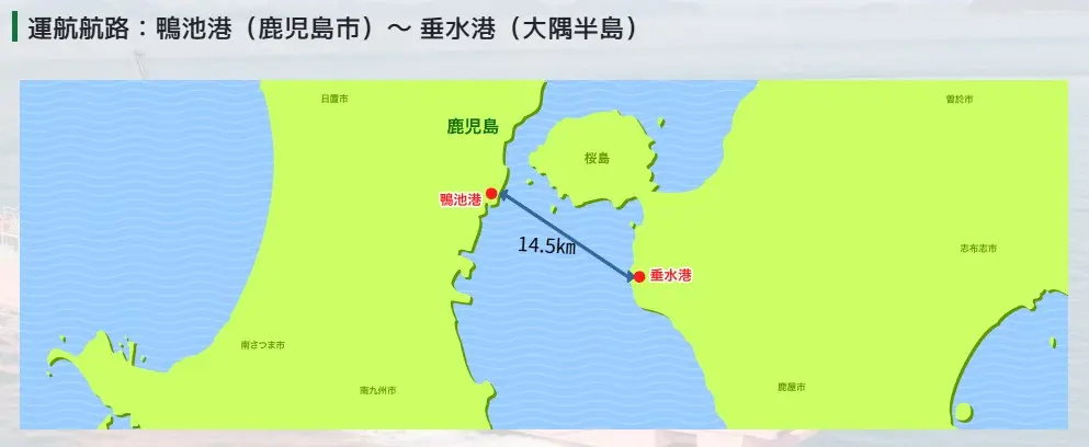 鹿児島県薩摩半島の山川と、大隅半島の根占を結ぶカーフェリーです。