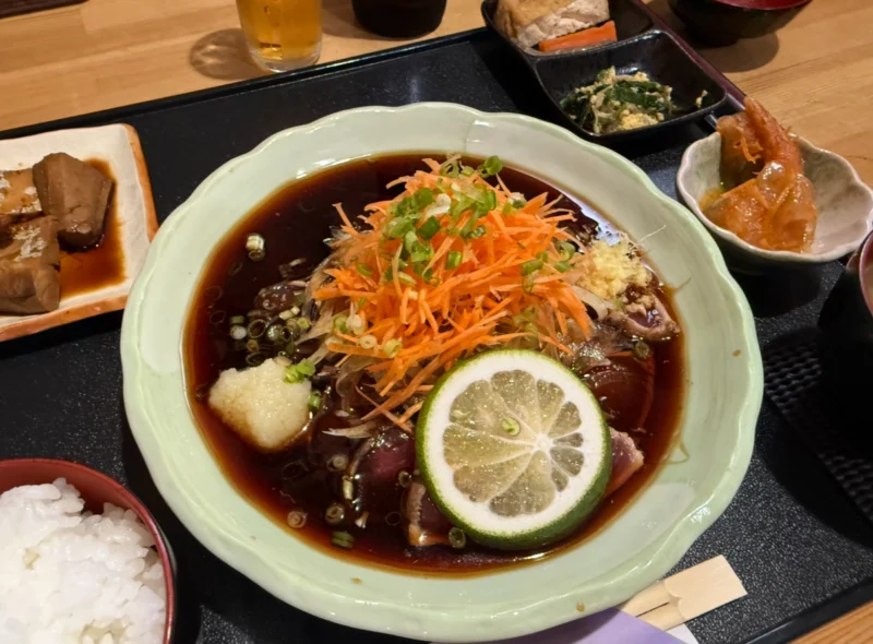 メニューも豊富で迷った挙句、おすすめの「カツオのタタキ定食」を頂くことに。