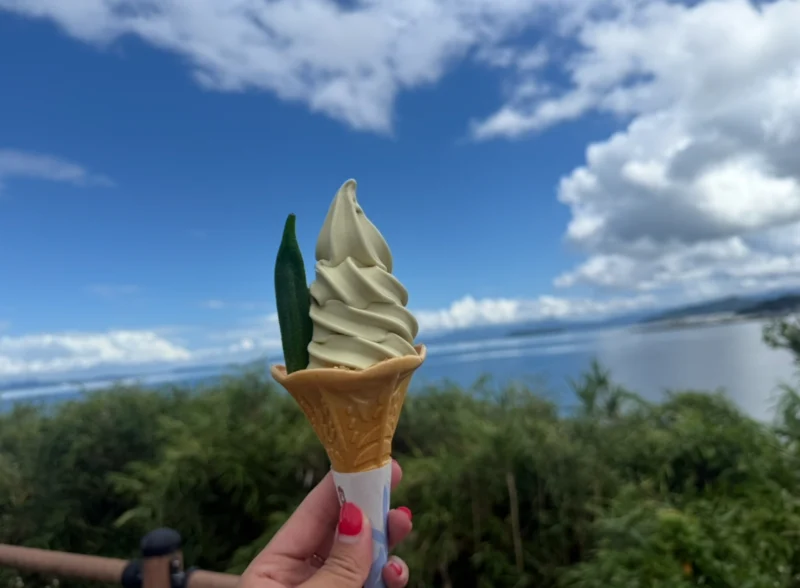 地元の農産物、オクラを4本使用しているソフトクリーム。