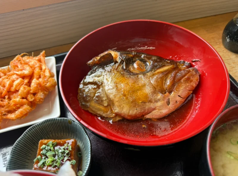 かき揚げと、あら炊き、カンパチ海鮮丼のセットでボリューム満点です。