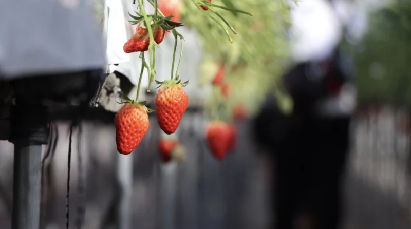 高設栽培なので、土で地面が汚れることもなく、立ったままでいちごが取りやすい位置に並んでいます。