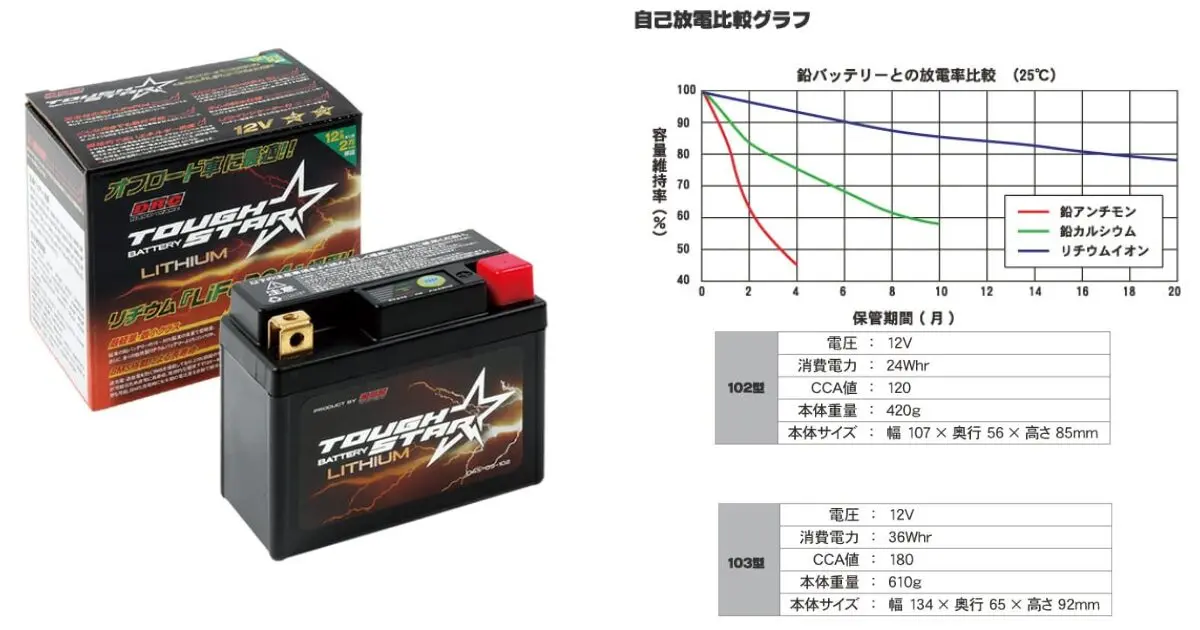 だからこそ、「リチウムバッテリー+定期充電」対策が効果的。軽量で放電しにくいリチウムバッテリーなら、冬場でも安定した電圧を維持でき、バッテリーあがりを防ぐことができます。
