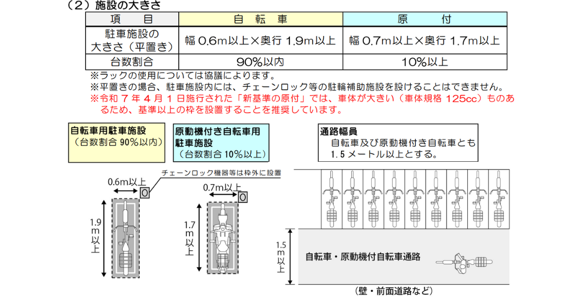 全国の自治体へ「新基準原付も停められるよう運用や規約を見直すこと」を求める通知を出しました。物理的に駐車可能であれば、排気量のみを理由に排除しない柔軟な運用や、今後の施設整備における規格の再検討を求めています。 - 自治体・条例の変化: 各自治体が定める「附置義務条例(商業施設等への駐輪場設置ルール)」でも変化が起きています。例えば福岡市などでは、車体の大型化を見越して「駐車枠を従来より広く設定すること(※新基準原付対応)」を推奨する手引きの改訂が行われています。