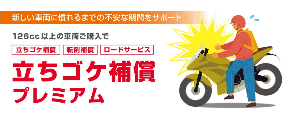 「新しい車両の取り扱いに不安がある」「免許取得したばかりで転倒しないか不安」こうしたお客様の声から生まれた新補償サービスが「立ちゴケ補償プレミアム」です。
