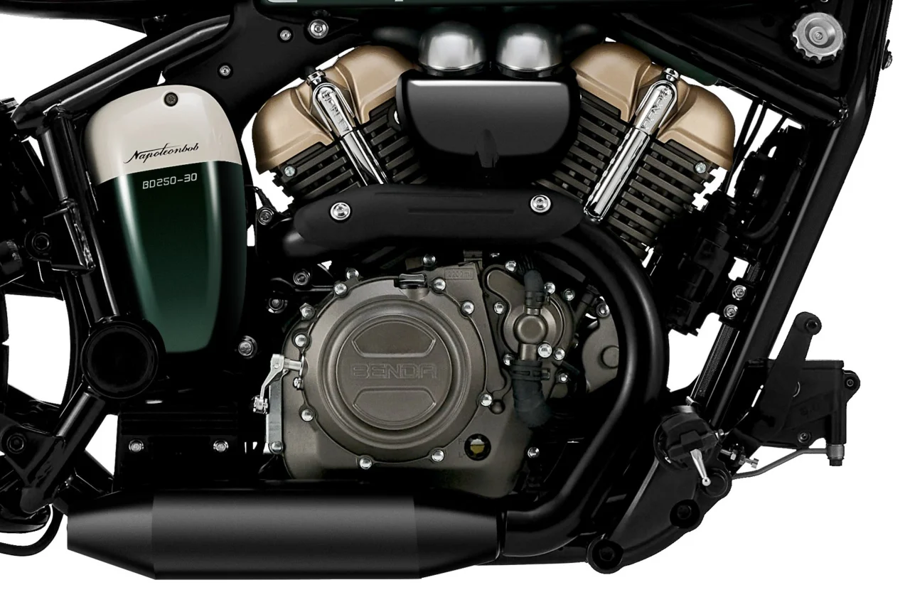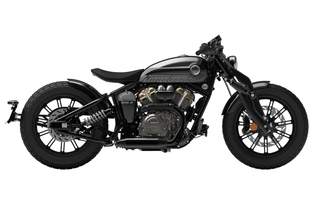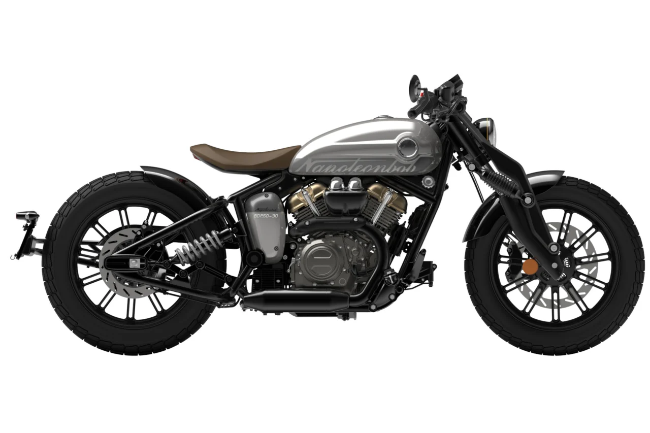 日本市場には特徴的なデザインの 250cc クラス「Naporeonbob250(ナポレオンボブ 250)」から取り扱いを開始いたします。このモデルはネオクラシックのクルーザータイプで圧倒的な存在感、唯一無二のモーターサイクルとなっています。