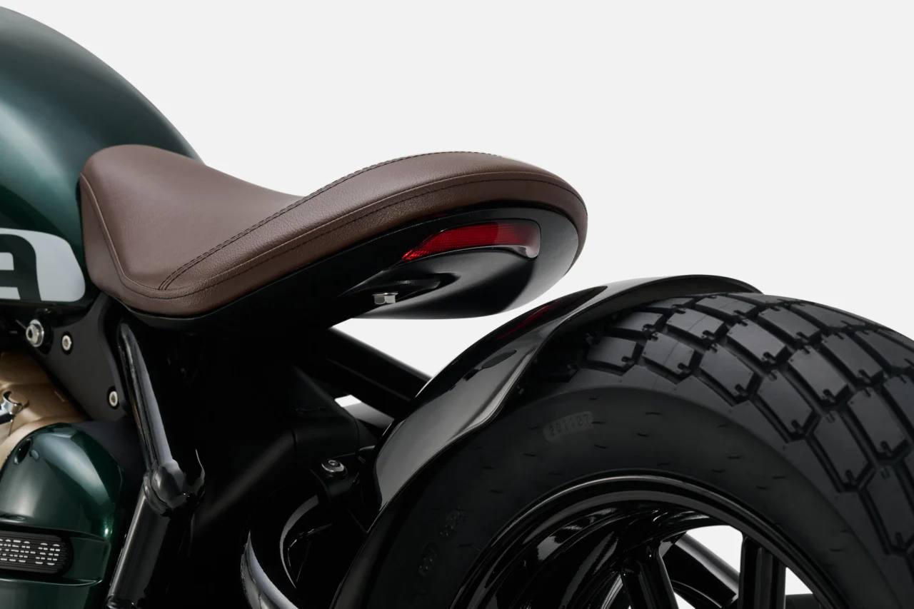 テールランプユニットが組み込まれたスリークなソロシート。低いシート高(748mm)とスリムな車体構成が良好な足つき性を実現しています。