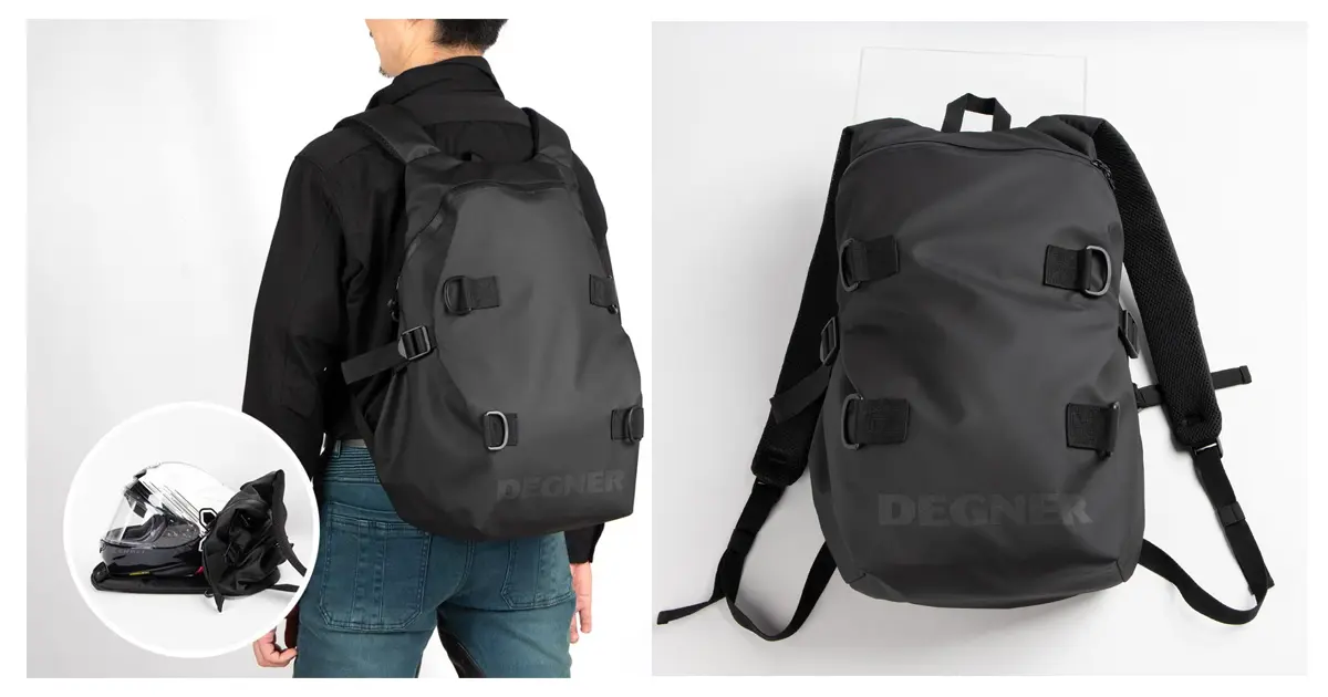 デグナーのモーターサイクルバックパックは、ヘルメットがすっぽり収まるバックパック。出先でのヘルメットの盗難防止になり、持ち運びに最適です。