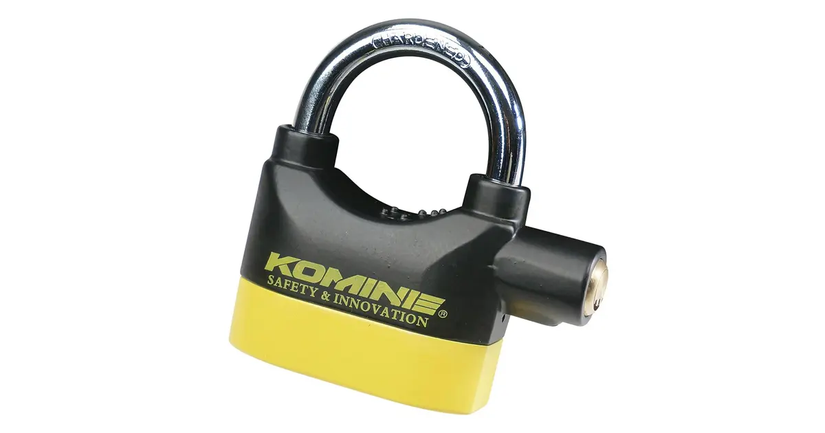 振動を感知すると警告音を発するコミネのアラーム付きパッドロック。パッドロックとは南京錠型のことで、ディスクロックとしてだけでなく、手持ちのチェーンなどと組み合わせて使用もできます。アラーム機能はU字シャックルの差し込み方の向きでON、OFFが選択できます。