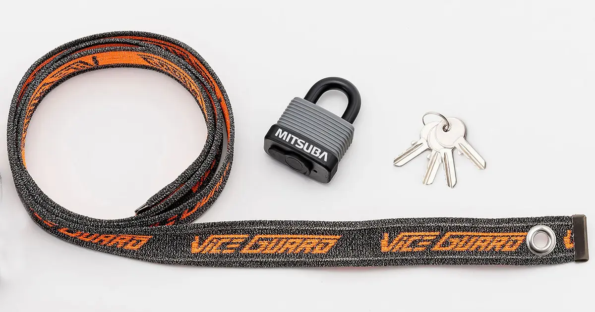 ヘルメットはもちろん、ツーリング先でいちいち外すのが面倒なバッグ類を留めておくのにもおすすめです。小さく丸めて収納できるので、バイクのシート下やジャケットのポケットなどに入れて持ち運べます。バイスガードエア コンボは南京錠とベルトのセットです。