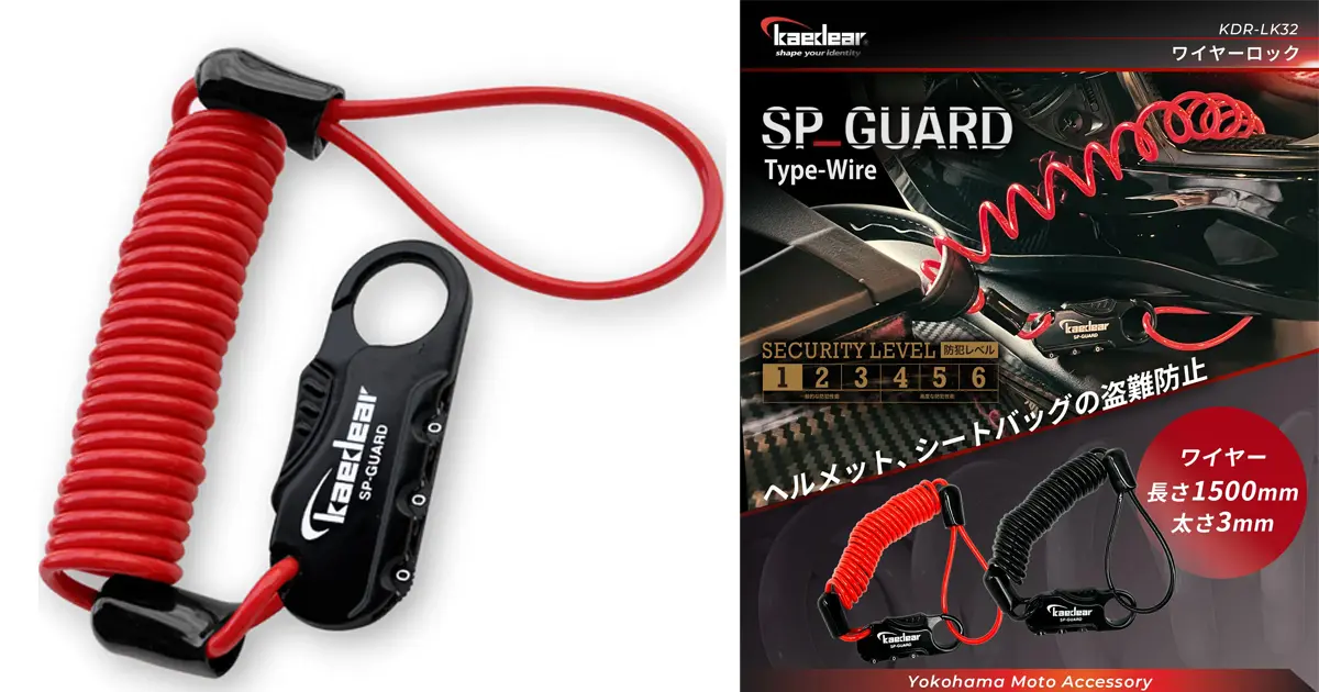 カエディアのSPガードは、ヘルメットロックやシートバッグ、小物などの簡易的な盗難防止にぴったりなワイヤーロック。錆びない強靭なカシメと、外形が太くて丈夫な内部のステンレスワイヤーでバイク用品を守ります。解錠したまま3桁の暗証番号を設定して施錠します。エナメルコーティングなので、バイク車体も傷つけません。