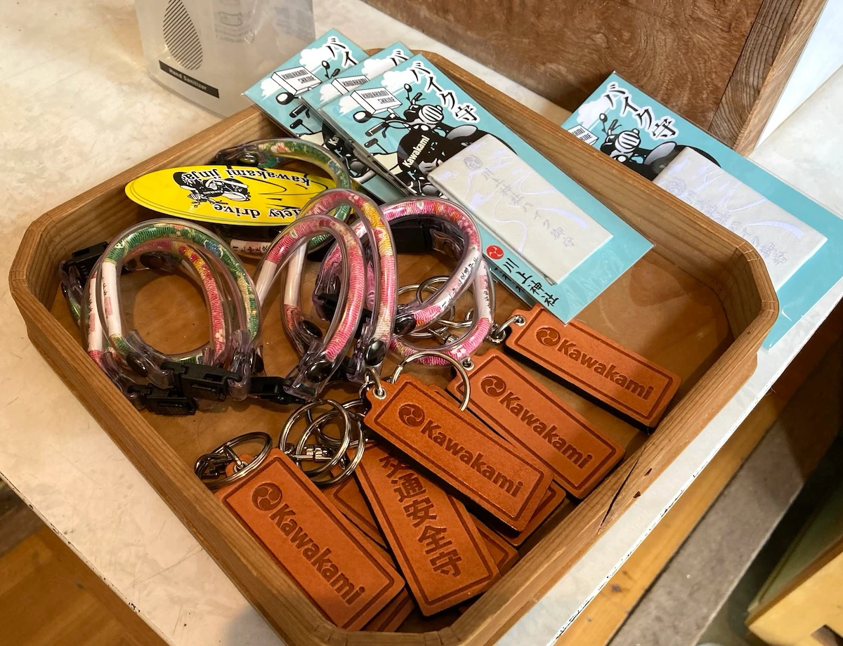 川上神社の社務所では、ライダーなら「買わない」という選択肢が無いに等しいバイクのお守りやキーホルダーが販売されており、宮司さんのしたたか…いや、バイクに対する熱い思いを感じざるを得ません!