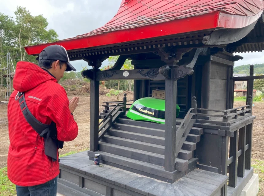 実際、宮司さんは漢カワサキのバイクに乗っている…かは不明ですが、とにかくバイクに乗る宮司さんのようで、なんと「國魂神、大己貴神、少彦名神、天照大御神、豊受大神」という5柱の神様を祀っている、由緒正しき川上神社の境内にこれを設置してしまったようです(いいのかな…)