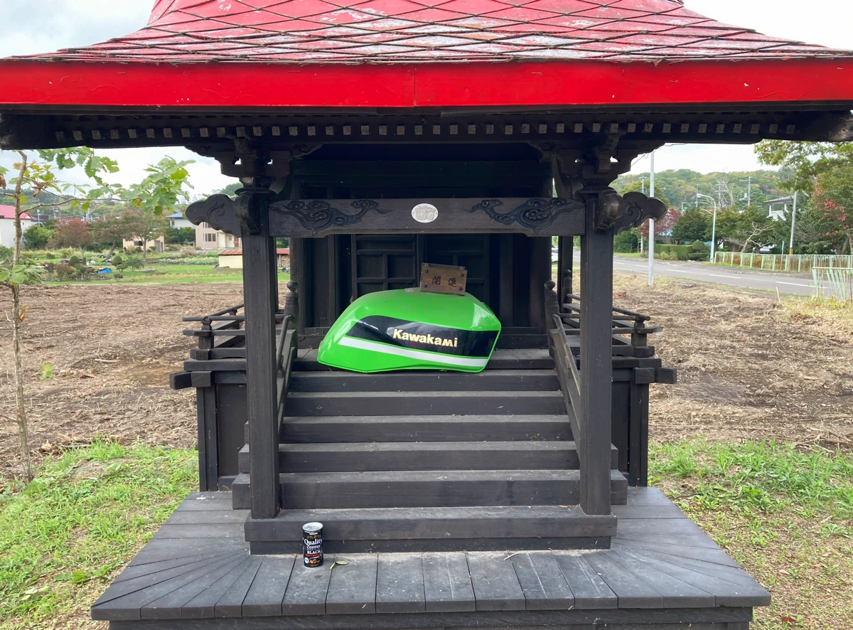 なんせどう見ても「kawasaki」のタンクを祀っているよう見えますが、これがよく見ると「kawakami」だったりするので…これはどう考えても宮司さんが確信犯としか思えません!