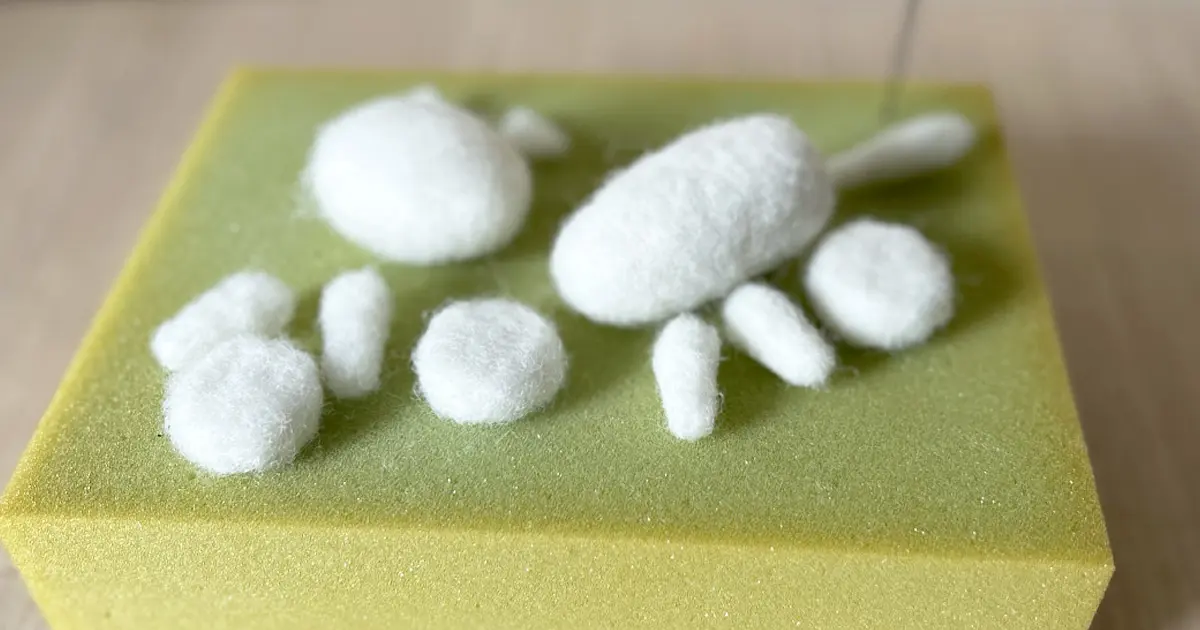 羊毛フェルトとは、主にニードルフェルトという技法の手芸のことを指します。専用の針(フェルティングニードル)で羊毛をチクチクと刺して繊維を絡ませ、立体を作ります。