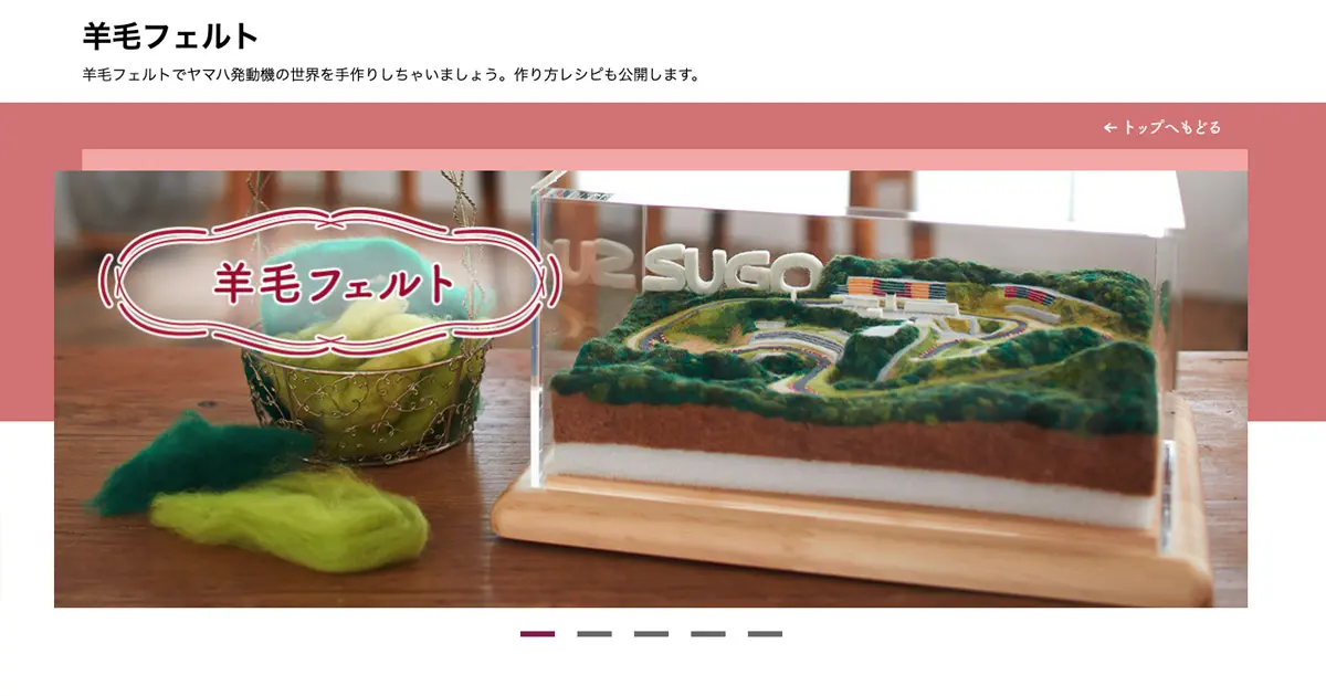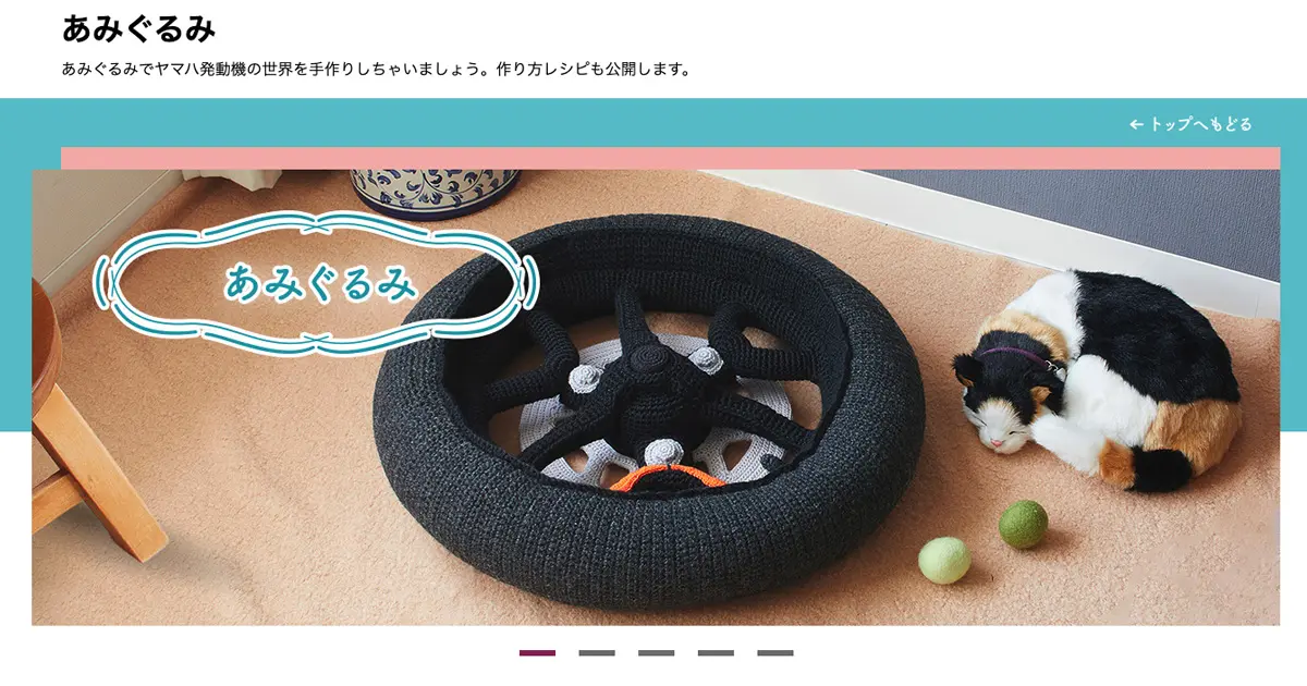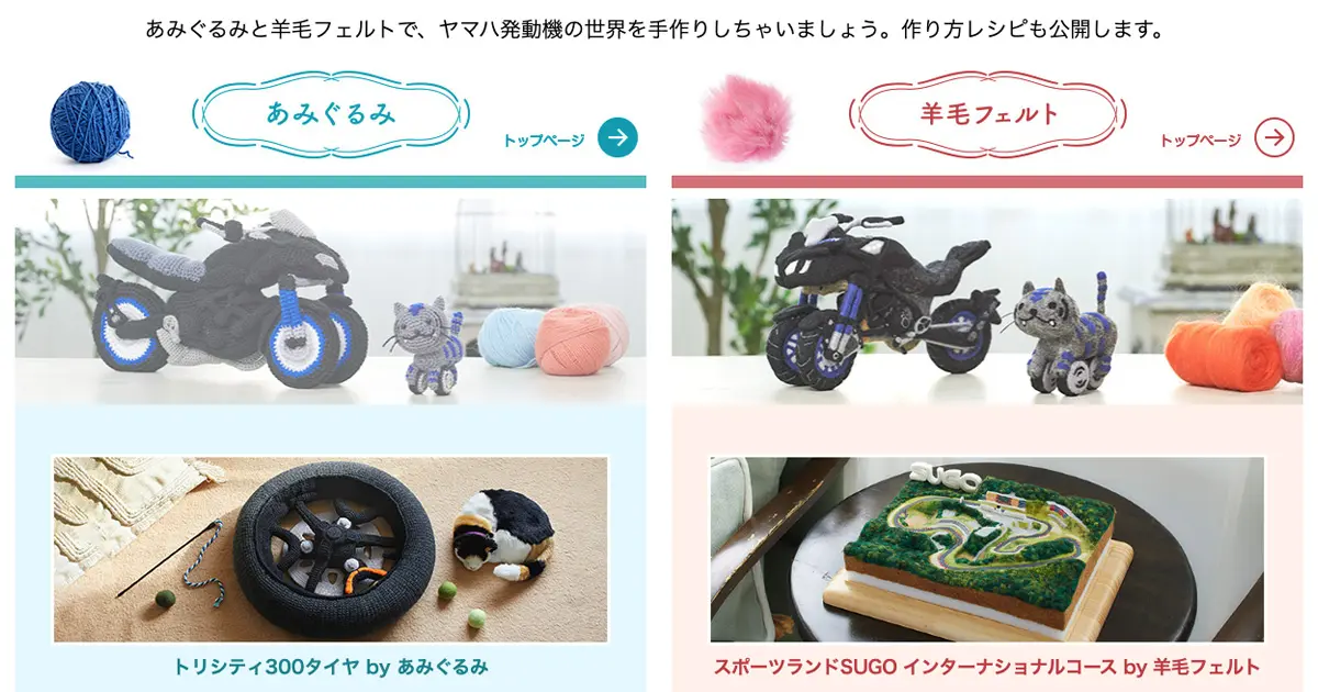 ヤマハ発動機の公式サイトでは、ヤマハ発動機の世界を手作りしちゃおう!というコンテンツとして「あみぐるみ・羊毛フェルト」の手芸作例が紹介されています。バイクと手芸という、少し毛色の異なる世界が融合しており、なんとも言えない優しさとやわらかさが感じられるページです。