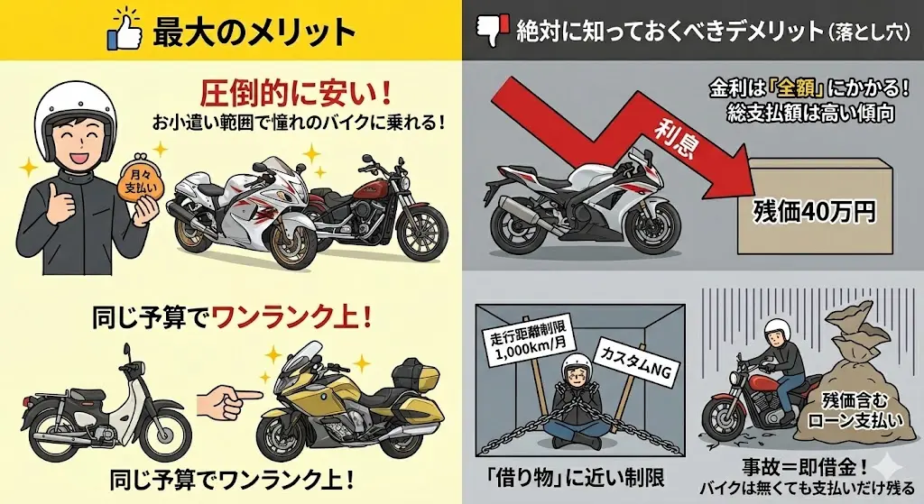 - 事故・盗難のリスク: 事故や盗難などでバイクが無くなっても「残価を含めたローンの支払い」だけが残ります。